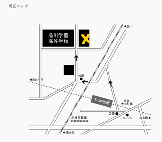 品川学藝高等学校の校舎の、車道を挟んで右側(黄色い×印)の建物内に中ホールがあります。